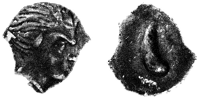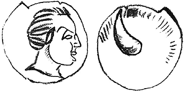 >Droit : Tête Juvénile à droite, la chevelure tirée en arrière ; l'oreille a une forme ovale allongée ; les traits du personnage présentent quelques caractères négroïdes
