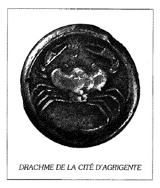 Ce processus d'imitation puis de « transformation » monétaire est courant dans l'histoire numismatique et, d'ailleurs, les Massaliotes l'ont également expérimenté pour leur propre monnaie ! C'est ainsi qu'ils imitèrent les oboles frappées dans la Cité d'Agrigente en Sicile, en faisant figurer un crabe sur le revers de certaines de leurs oboles d'argent, comme sur celles de cette cité. Ce crustacé permet en effet de reconnaftre au premier coup d'oeil une monnaie d'Agrigente (en grec AK PAI-At ). C'est là une preuve matérielle qu'il y eut des relations commerciales engagées entre Agrigente et Massalia.