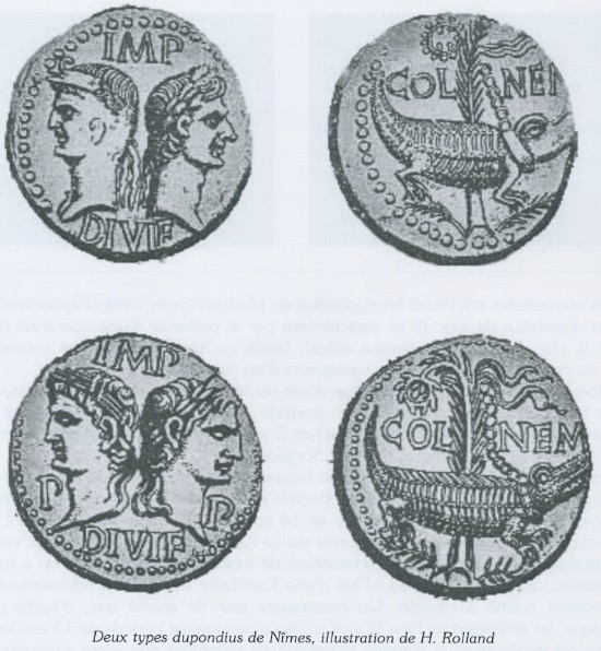 Même s'il est usé, le fragment de cette monnaie présente encore un beau portrait d'Auguste, et, sur son revers, on peut encore distinguer la tête du crocodile. Sur les dupondius complets, ce crocodile est attaché par une chaîne à une palme ou un palmier et cette scène est célèbre parce qu'elle est devenue l'emblème officiel de la ville de Nîmes. L'explication de la présence de ce reptile est amusante ou plutôt satirique. Il s'agirait d'une allusion grotesque, un quolibet, visant à ridiculiser Marc Antoine, personnifié sous les traits d'un crocodile lourdaud (mais aux dents longues, comme il se doit pour un politicien), enchaîné à sa compagne Cléopâtre que désigne le palmier qui évoquerait l'Egypte. Des numismates très observateurs ont également remarqué qu'une galère était gravée sur les deniers frappés par les légions de Marc Antoine et que sa forme évoque fortement un crocodile, ce qui suggère que l'artiste qui a gravé le coin monétaire du dupondius s'est sans doute bien amusé : il aurait poussé l'humour jusqu'à caricaturer une galère romaine !