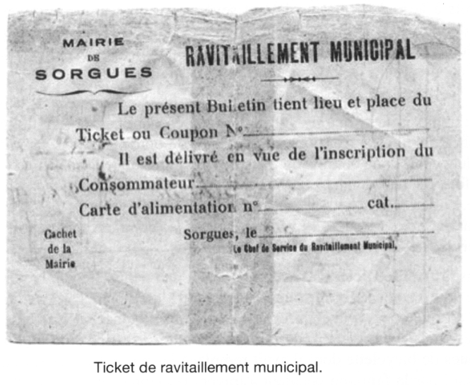 À des périodes plus ou moins longues, devant l'épicerie Boyer, place de la mairie, des Sorguais se massaient autour de la porte d'entrée attendant sagement leur tour. Ils achetaient des brisures de biscuits. Le commerçant s'était procuré ce précieux dessert à la Biscuiterie Rhodannienne, avenue du griffon (31). Nos compatriotes, armés de patience, prirent l'habitude, pour se nourrir, se distraire, payer leurs impôts ou fumer, de prendre rang derrière un dos et au côté d'inconnus dont les coudes constituaient le principal moyen d'expression. (32) L'être humain s'accommode des situations les plus difficiles.