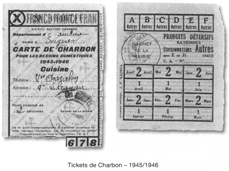 Le charbon domestique n'était délivré que parcimonieusement par le marchand de combustible, d'après la valeur attribuée par le préfet, suivant les disponibilités du moment, aux tickets numérotés de la « Carte charbon ». Les citoyens étaient obligés d'acheter, s'ils en avaient les moyens, du bois vert qui était vendu au prix exorbitant de 150, 180, 200 francs le quintal. Il provenait le plus souvent d'arbres abattus depuis peu.