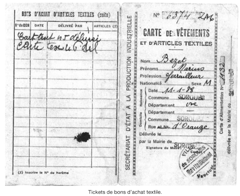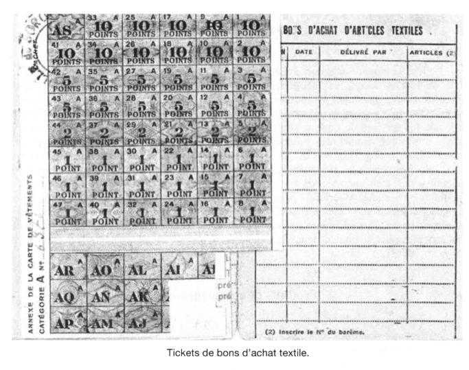 Chaque mois, les consommateurs défilaient à la mairie pour retirer leurs feuilles de tickets de rationnement, pour le pain, la viande, le sucre, le lait, le fromage, les matières grasses diverses (beurre, huile, margarine, saindoux).Le café, le chocolat furent strictement rationnés ; plus tard, ce fut au tour des pommes de terre, suivies par le lait, le vin et les légumes secs.