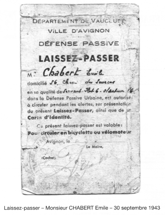 À vingt et une heures, il était interdit de sortir. C'était le couvre-feu. Sorgues était plongé dans le noir. Les fenêtres sans aucun volet devaient être occultées par une peinture bleue ; pour les autres, les contrevents étaient obligatoirement clos. Les déplacements d'un village à l'autre ne pouvaient se faire dépourvus de papier d'identité. Le risque d'être arrêté, sans ménagement par les GMR (12) ou une brigade d'Allemands, était grand, et d'être accompagné sous la menace d'une arme au poste de police voisin. Après novembre mil neuf cent quarante-deux, avec l'entrée des Allemands en zone dite libre, on vit circuler dans Sorgues une police supplémentaire en la personne du commandant Simon, officier allemand en garnison au Pontet. Il circulait sur un Bide-car, le fusil mitrailleur en bandoulière, chargé par l'autorité occupante de la bonne tenue des militaires, sans oublier qu'il surveillait les Français. (13)