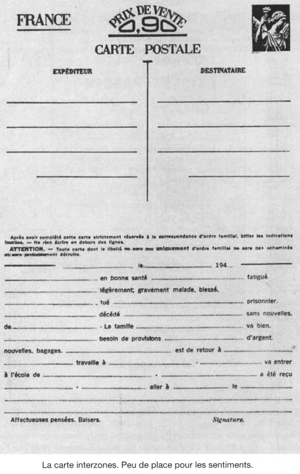 Le secret de la correspondance n'existait plus. Vichy mit en place une masse énorme de censeurs. La commission qui exerçait à Sorgues contrôla, pour l'année 1940, 806 lettres expédiées, dont 520, furent lues. (57) . Le 22 juin 1940, l'Armistice signé avec l'Allemagne nazie eut pour conséquence de modifier la géographie de la France en deux zones, celle du Nord dite occupée, libre au Sud. Ce découpage fut immédiatement violé par l'occupant qui partagea la zone Nord en trois territoires -, mais ce n'est pas l'objet du texte -. Conséquence postale de ces découpages, les échanges de courrier entre les régions furent suspendus le ler août 1940. Ils se firent sous forme de cartes postales prétimbrées, avec l'allégorie d'Isis (58), le recto divisé en deux parties l'une indiquant le nom et l'adresse de l'expéditeur, l'autre le nom et l'adresse du destinataire, au verso quatre lignes de recommandations suivies de phrases à compléter. (59) La censure se montrait impitoyable, toute carte non réglementaire était retournée à l'envoyeur.
