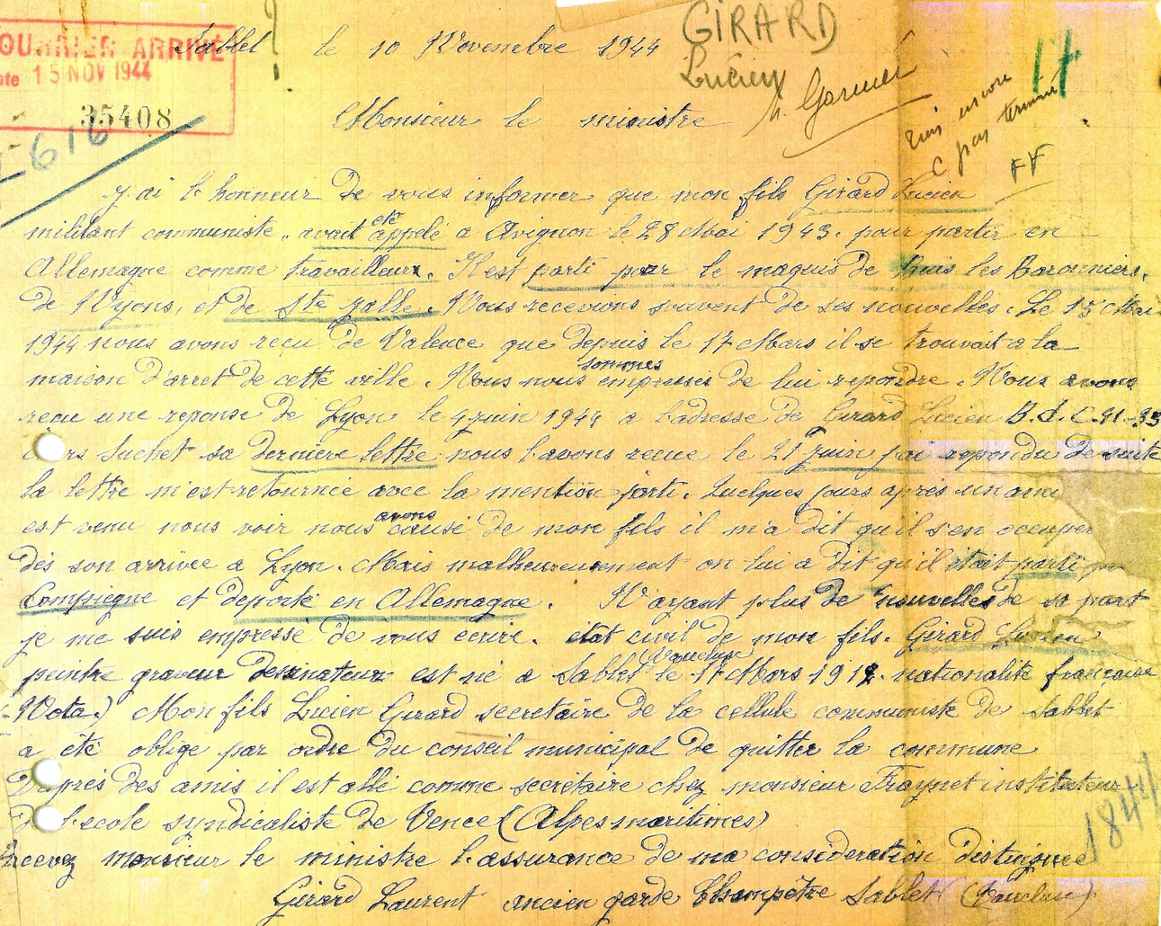 Ils dégénéraient en actes de barbarie « … lorsqu’on le reconduisait dans sa cellule, à la suite des mauvais traitements, Girard était presque incapable de marcher ». (5) De là, il adressait très souvent de ses nouvelles à ses parents. Le 15 mai 1944, ceux-ci reçurent de Valence un message leur précisant que leur fils se trouvait à la maison d’arrêt de Lyon. Le 29 juin, il partit de la prison Saint-Paul pour Dachau (Allemagne) du 1er.