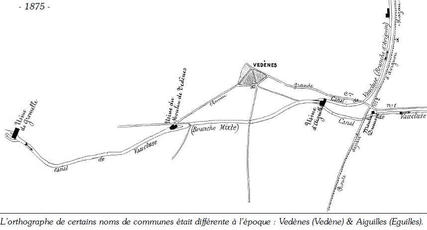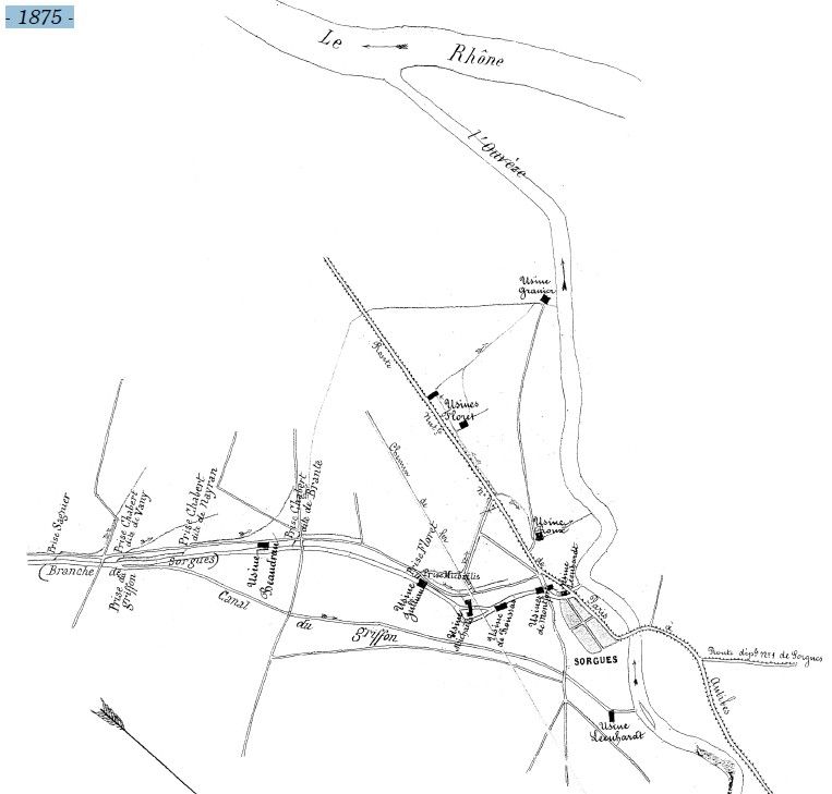 En 1875, le canal de Vaucluse permettait à neuf fabriques de travailler, c’étaient les usines Beaudran, route de Vedène, Jullian sur l’emplacement de laquelle se trouve la salle des fêtes, Michaëlis, à présent les bâtiments communaux de la rue de la coquille, de Roussas au quartier du Ronquet, de Montfort, à l’emplacement du rond-point de la fontaine, enfin l’usine Leenhardt, à présent l’immeuble englobant la bibliothèque « Jean Tortel »… De plus, un bief alimentait l’usine Roux, rue Saint-Hubert (anciennement rue de la Ferraille), l’usine Floret à la Floride et l’usine Granier au domaine de Fontgaillarde.
