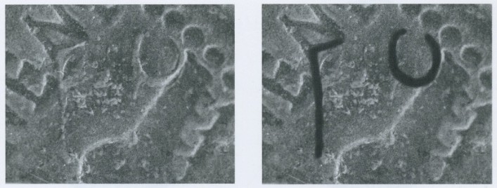 Car le fait est là et je l'ai découvert près du museau du crocodile : ce dupondius présente à cet endroit une marque monétaire de forme circulaire, peut-être un simple coup avec un poinçon rond et creux, à moins qu'il ne s'agisse d'une marque plus complexe dont le centre aurait été abrasé et rendu illisible par l'usure. Un examen à la loupe binoculaire a également fait apparaître des graffitis profondément gravés par un objet sans doute très affûté semblable à une échoppe de bijoutier. Ce type de graffitis gravés sur une pièce antique n'est pas rare et apporte parfois un supplément d'information précieux pour les numismates, plus souvent les quelques lettres ou signes gravés restent un mystère... comme dans le cas qui nous intéresse ici.