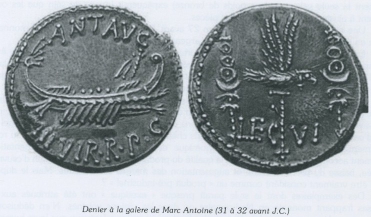 Il s'agit d'une monnaie commémorative de la bataille d'Actium, cette victoire navale remporté par la flotte romaine commandée par Agrippa et Octave (Auguste) contre celle de Marc-Antoine, renforcée par la flotte égyptienne de Cléopâtre VII.