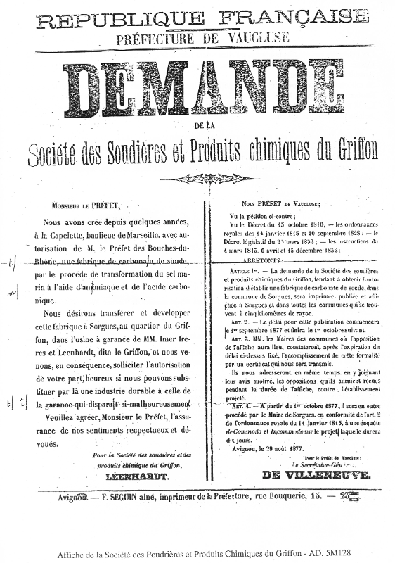 Le 12 Aout 1877, Monsieur Leenhardt écrit au Préfet de Vaucluse pour demander l'autorisation de transférer, dans l'usine à Garance à Sorgues, une fabrication de Carbonate de Soude par la décomposition de sel marin au moyen d'ammoniaque, et d'acide carbonique, sise à la Capelette à Marseille.