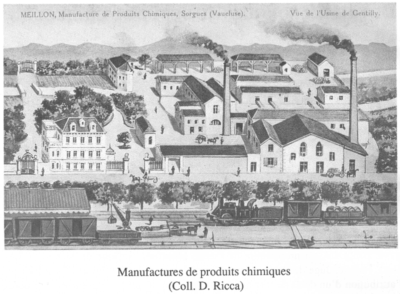 La Compagnie Générale des Produits Chimiques du Midi (C.G.P.C.M.) propriétaire de l'usine de Rassuen (Bouches-du-Rhône) acquiert, en 1886, celle du Griffon. Ensemble elles produisent du carbonate de soude destiné, en majeure partie, aux savonniers marseillais. La C.G.P.C.M. a été fondée par Félix Chrysostome GARDAIR. Son arrière-petit-fils, André ROUSSIN, vaudevilliste célèbre, conte, dans un livre de souvenirs "La Boîte à Couleurs", sa visite en 1920 de l'usine de Rassuen sous la direction du Grand'Père : "Puis le Grand Chef m'amena visiter l'usine. J'entrai dans le monde du soufre, du chlore, des alcalis, du nitrate. Je passai du laboratoire et de ses centaines de cornues à la salle des cuves d'acide sulfurique, une cave aux énormes bonbonnes. Je suivis la fabrication de l'acide sulfurique, expliquée par un chimiste, c'est-à-dire que je ne compris rien, entendant passer des mots, des formules qui me semblaient chinoises. J'écoutais moins que je ne regardais et je regardais les murs couverts d'une poudre jaunâtre, les machines, les fours. Je regardais les hommes qui travaillaient dans cette saleté, dans ces odeurs ammoniacales, dans cette chaleur, cette pénonbre, le bruit. Ils allaient, venaient, tournaient machinalement. Moi je suivais le guide ; le tour fini nous regagnâmes l'air pur. (18)." Félix GOUIN, toujours de RASSUEN, vers 1935 la décrit ainsi : "Des hommes musclés, à moitié nus, éclairés par l'enfer du four à réverbère brassent d'abord, attelés à deux à l'énorme râble, la masse de soude pâteuse étalée sur la sole puis, quand la chaleur du foyer a terminé les réactions nécessaires, la font couler en fleuve de feu dans le moule de tôle. Celui-ci rempli, deux "démons" s'y attellent et le mènent près des moules où la cuite précédente continue à dégager mille petites flammèches. Un second moule est encore rempli et conduit près du premier : la cuite est tirée. Cependant, sur d'autres moules un peu refroidis à la surface desquels errent encore, incertains, quelques rares feux follets, des pot-au-feu mijotent, des côtelettes se grillent ; autour d'une table, aux moments de pause, quand le travail du four le permet, on mange, on boit, on parle, on chante. Et toujours le bruit sourd et saccadé de la broyeuse de calcaire, toujours le grincement des grues et des chariots ! Les ouvriers se protégeaient du mieux possible des vapeurs acides par des chiffons ou des éponges mouillées qu'ils attachaient sur leur bouche ; au cours de la fabrication de l'acide sulfurique dans les chambres de gaz de plomb, il se dégageait beaucoup de gaz acide sulfureux et des vapeurs nitreuses rouges : quand les vapeurs suffoquent tellement les ouvriers qu'ils ne peuvent point approcher des portes, ils disent que "la chambre est dure" ; ils disent au contraire qu'elle est bonne ou "douce" lorsqu'on ne voit sortir que des vapeurs rouges qui ne les empêchent pas de travailler.» (19).