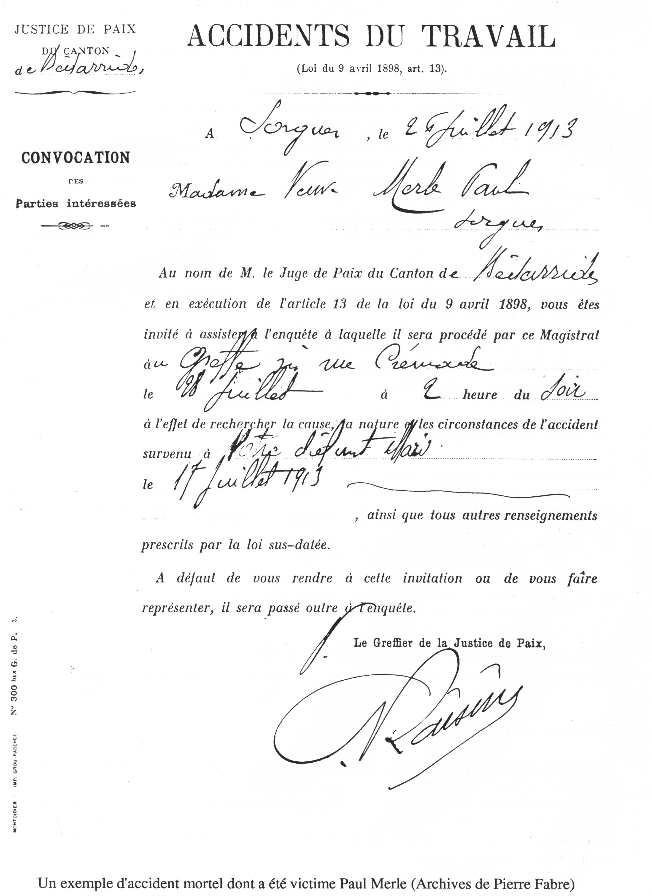 Les fabricants ne se préoccupent guère de savoir si leurs ouvriers ont peu ou prou d'eau nécessaire à leur propreté corporelle (14). Pas de lieux d'aisances ou ceux qui existent ne peuvent servir en aucune façon (15). Dans toutes les fabriques, les courroies de transmissions ne sont absolument pas protégées. C'est la source de graves accidents . Leur multiplicité n'amène pas les fabricants à doter leurs machines-outils de garde-corps (16). Parmi les nombreux drames survenus au cours des dix premières années de ce siècle, celui de Jules JOUVE mérite d'être conté. Jules JOUVE a 20 ans. Il travaille à la SOCIETE DES PHOSPHATES ET ENGRAIS CHIMIQUES DU SUD-EST, usine de la Grange des Roues. Employé au transport de l'engrais le 18 août 1913, il est pris entre une poulie et une courroie de transmission. Il a les deux bras broyés, et le haut de la cuisse gauche porte une forte plaie produite par l'éclatement de la peau. Voici la relation qu'en donne le Directeur : "Dans la nuit du 18 au 19 août, vers les 9 heures et demie du soir, j'ai été appelé par un de mes ouvriers qui venait m'informer qu'un accident grave venait d'arriver à son neveu Jules JOUVE, ouvrier comme lui. Je me suis rendu immédiatement sur les lieux et j'ai trouvé en effet Jules JOUVE allongé par terre, dans la salle des anciennes bluteries, paraissant souffrir beaucoup et j'ai constaté qu'il avait les deux bras inertes, sanglants, broyés, la cuisse gauche ouverte entre le genou et l'aine ; le contremaître et les camarades étaient déjà auprès de lui et lui mouillaient la tête pour le secourir. Personne n'a pu se rendre compte comment l'accident est arrivé. Je suis retourné immédiatement chez moi chercher du linge, des cordiaux, pour procéder aux premiers pansements ; pendant ce temps, je faisais prévenir le Docteur Roche d'avoir à se rendre sans retard auprès du blessé. Le Docteur Roche, à son arrivée, a examiné le blessé, a procédé au pansement sommaire des deux bras, au lavage de la plaie de la cuisse. Puis il m'a déclaré qu'il considérait les deux bras comme à peu près perdus et qu'il n'y avait pas à Sorgues les moyens nécessaires pour procéder aux opérations très sérieuses qu'importait la situation et il m'a conseillé de faire transporter le blessé à l'hôpital d'Avignon. Je l'ai immédiatement fait mettre sur une jardinière, sur un matelas enveloppé de couvertures, j'ai pris moi-même une autre voiture et l'ai accompagné à l'hôpital d'Avignon. Après l'avoir remis aux mains du personnel, je me suis retiré vers les 3 heures du matin, comptant aller le revoir avec sa famille dans la journée lorsque, vers les 10 heures, le 19, j'ai été informé que le blessé était décédé et qu'on me chargeait en même temps d'en informer la famille, ce que je fis tout de suite. (17). " Jules JOUVE n'avait pas de parent direct, à l'exception de sa mère impotante. A l'enquête sur les causes de l'accident, il n'y aura pas d'autre témoignage que celui de son employeur non présent sur les lieux au moment du drame.