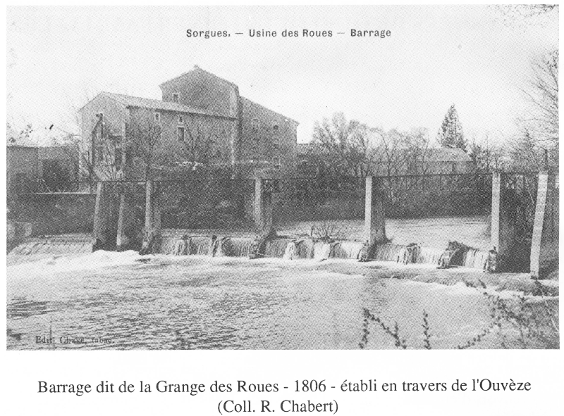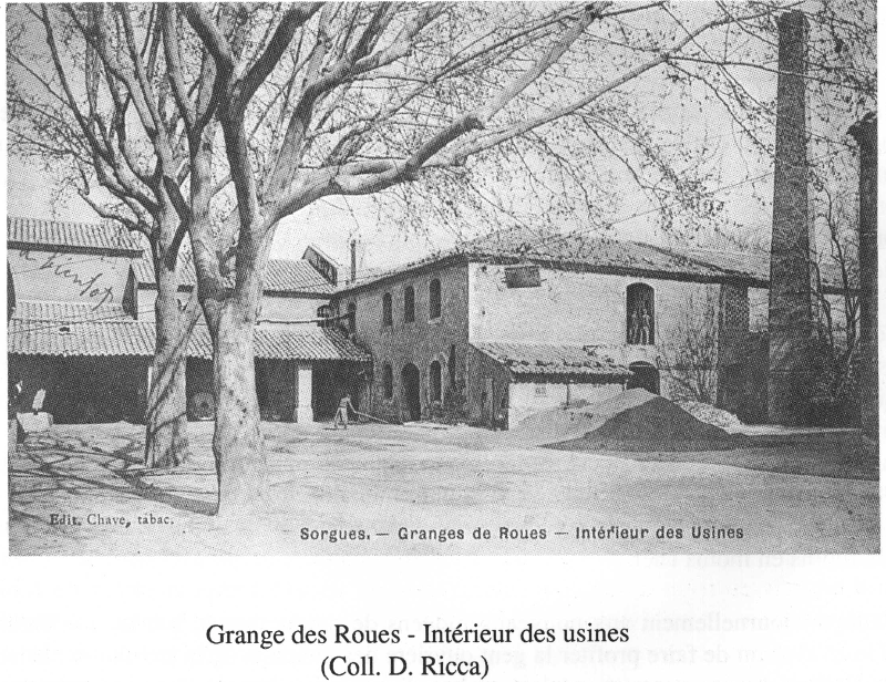 Le nom de cette usine rappelle certainement pas mal de souvenirs à certains vieux Sorguais, d'aucuns pour y avoir travaillé, d'autres pour être allés se baigner dans l'Ouvèze en aval du barrage construit bien avant 1914, et enfin pour certains pour y être allés taquiner le goujon sous les frais ombrages. Tout d'abord, vous êtes-vous posé la question : « Pourquoi le patronyme de « Grange des Roues » ?
