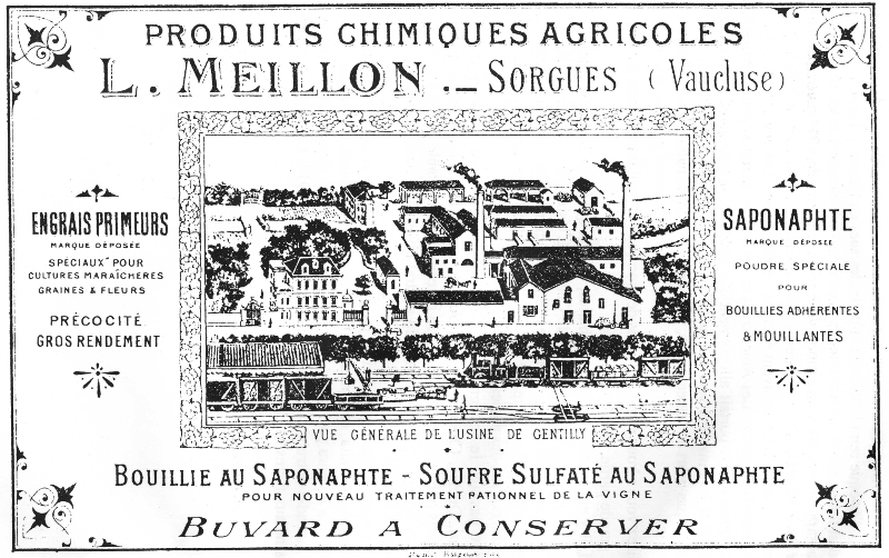 Une usine d'engrais survécut bien quelques années après 1920 : celle de M. MEILLON. Elle était située là où sont érigées la salle des fêtes et la cantine. Elle ne fabriquait que des engrais noirs organiques. La force motrice était fournie par l'eau de la Sorgue actionnant une turbine à roue horizontale de puissance 40 cv. L'ensemble avait été rénové lors de l'avènement, à la tête de la direction, de M. RASSIS.