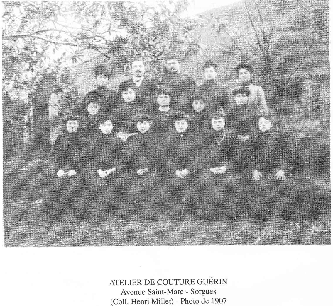 - ler rang du haut de gauche à droite : 1 - Langlois épouse GONNIN - 2 - Le repasseur à la presse - 3 et 4 les époux GUÉRIN Frédéric, patrons - 5 - LEYDIER Isabelle