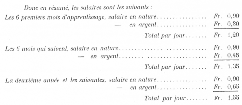 2- Un salaire en argent comme indiqué ci-après : Fr. 0,30 les 6 premiers mois d'apprentissage, Fr. 0,45 les 6 mois qui suivent, Fr. 0,65 la deuxième année et les suivantes. Les jeunes filles qui arrivent sachant travailler reçoivent de suite Fr. 0,65 par jour