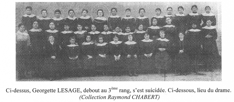 Pour essayer de fuir cet univers, elle boit après les malades atteintes de la grippe espagnole dans l'espoir d'être malade et conduite à l'hôpital. À vingt et un ans, elle touchera 500 francs pour le salaire de six années. Il est vrai qu'elle est nourrie et logée. La sévérité de l'endroit conduit une pensionnaire au suicide. Le père, au front (nous sommes pendant la Première Guerre mondiale), apprend que son épouse a noué une liaison. Père et employeur s'entendent, il doit y avoir rupture des relations entre mère et fille, les lettres échangées sont interceptées. Sans doute, inquiète de ne plus avoir de nouvelles, la mère « descend » de Paris. A l'usine, elle se heurte à la consigne, l'accès des lieux lui est interdit. Elle repart sans avoir vu sa fille, le malheur veut que cette dernière l'entr'aperçoive dans l'une des cours de la fabrique. Seule, déchirée par le chagrin, la mort lui semble préférable. Le 9 octobre 1922, Georgette LESAGE, « pupille au patronage des enfants délaissés de Seine-et-Oise », âgée de 16 ans, se jette dans le canal qui traverse la fabrique. Il y a parmi les pensionnaires une mineure de douze ans ; lorsque l'inspecteur du travail visite les lieux, on la cache dans la réserve à charbon.
