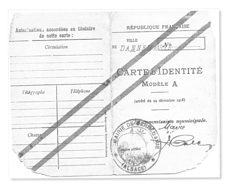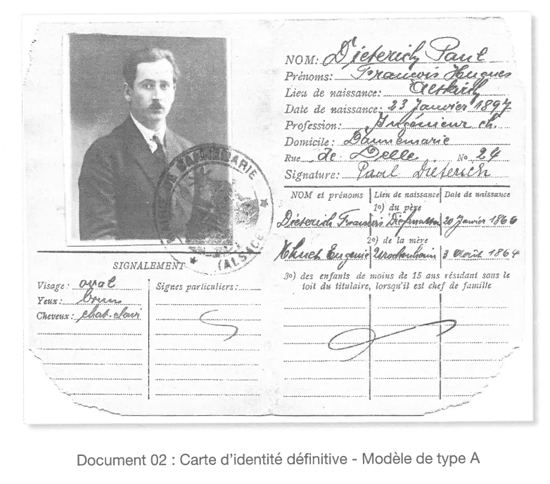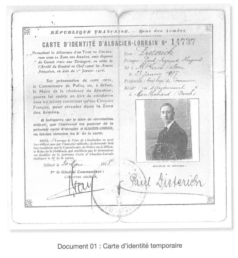 Le 30 mai 1918, le général, commandant la place de Montbéliard, lui délivra une carte d'identité d'Alsacien-Lorrain temporaire (cf document 01 ci-contre). Bien plus tard, la mairie de Dannemarie lui remit le modèle définitif de type A (cf document 02, page 36). Ce document était destiné exclusivement aux Alsaciens qui avaient la nationalité française avant 1870 ou, pour Paul Dieterich, ses parents et grands-parents étaient eux-mêmes français. (5) Les titulaires étaient réintégrés de plein droit dans la nationalité française. Ils bénéficiaient d'un taux avantageux pour l'échange de francs contre des marks.