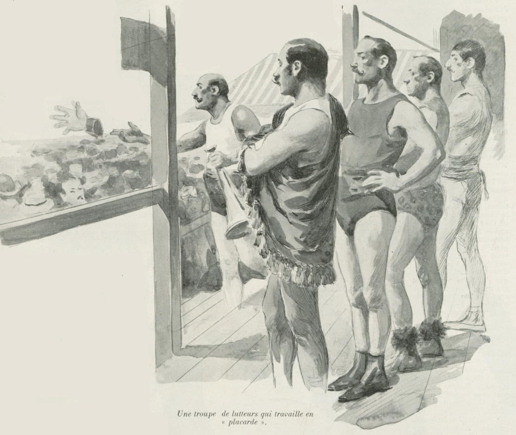 Une troupe de lutteurs qui travaille en « placarde » — la « placarde « c'est la place publique — est obligée, pour vivre, de donner dans une seule soirée quatre, cinq et même six séances, sans compter les représentations qu'elle doit fournir les jours fériés, en matinée. Combien durerait — en tenant compte des accidents toujours possibles — la carrière d'un homme qui serait tenu de s'employer à fond une demi-douzaine de fois par soirée ? Le tempérament le mieux trempé n'y résisterait pas trois mois.