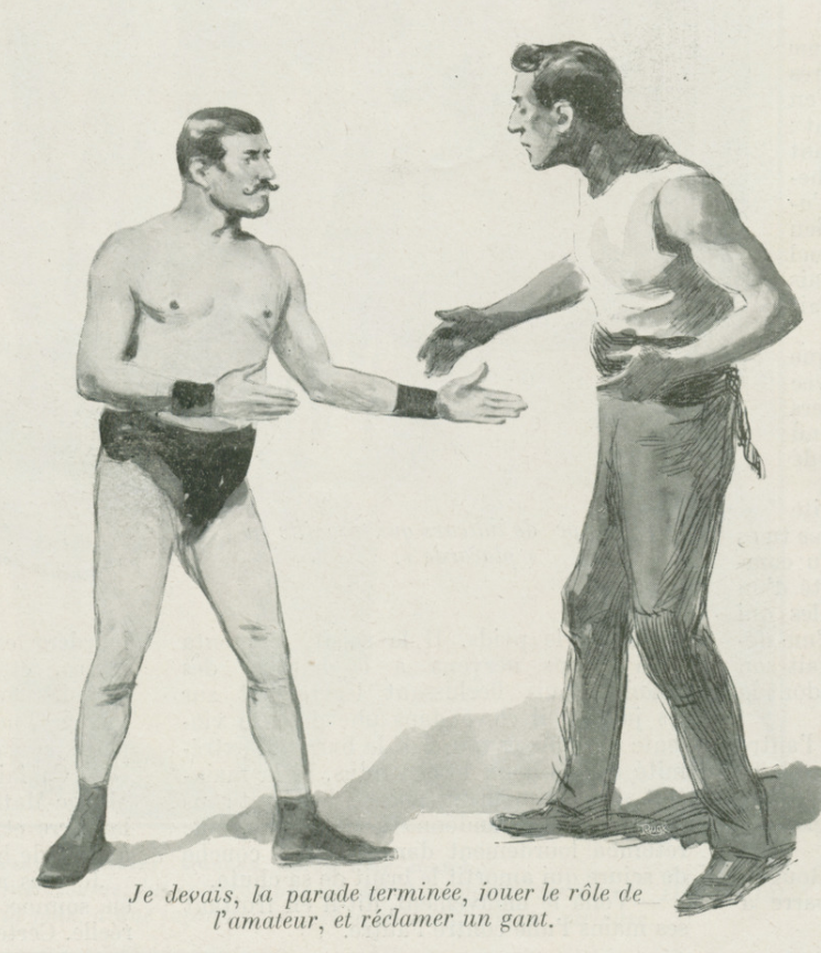 « Chiquer contre » c'est jouer le rôle du compère, mêlé à la foule comme un bon particulier qui écoute les sornettes du bonisseur, et qui demande un gant lorsque le semainier ou le patron de la troupe gueule dans son porte-voix : « A qui le gant ? » Je devais donc, la parade terminée, jouer le rôle de l'amateur et réclamer un gant pour lutter avec Cadit.