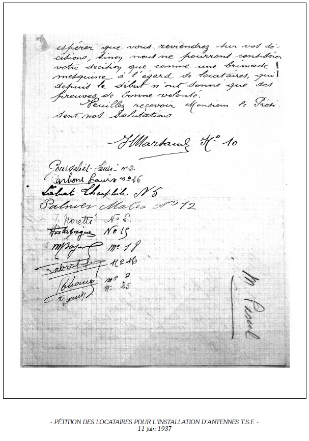 Il était interdit, par arrêté préfectoral, de poser sur les toitures une antenne de T.S.F ; cette interdiction avait été entraînée à la suite de réparations fréquentes des couvertures consécutives aux interventions de spécialistes, ou de locataires, pour la remise en place des antennes.