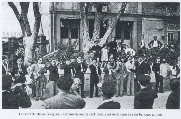 Enfin, donnant sur la place, le café-restaurant de la Gare avait le privilège de recevoir les rassemblements pour les banquets des associations diverses. Les conscrits, par exemple, après leur passage au conseil à Bédarrides, chef-lieu de canton, se réunissaient au restaurant pour terminer la journée par de joyeuses agapes. D'autres associations, telles que le Réveil Sorguais Fanfare, y tenaient leurs banquets annuels. Je me souviens de celui de 1938, j'avais participé avec mon père, j'avais alors 10 ans et je jouais du tambour. (photo).