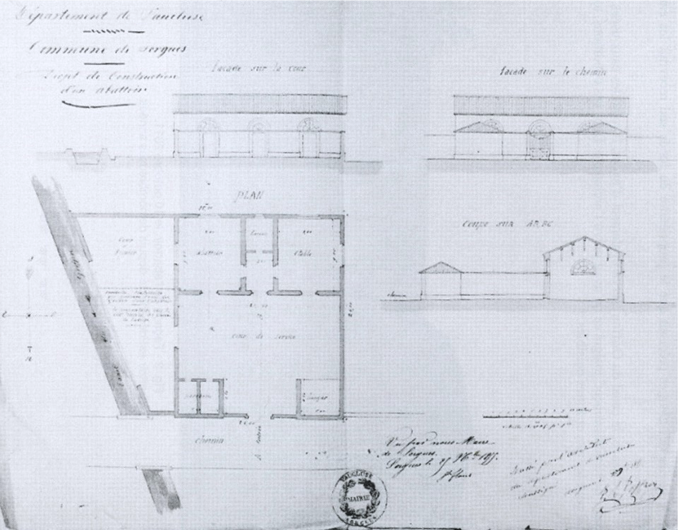 En avril 1825, sous la direction municipale de Légier de Montfort, Joseph Granget, maçon patenté, mandaté en qualité d'expert, rédigea un devis descriptif des travaux touchant à la rénovation des lieux. L'endroit projeté se trouvait au rez-de-chaussée de la salle de la maison commune, il était constitué d'une pièce unique : la « matérie (4) » pavée avec des « cailloux ordinaires », très accessible au travail des bouchers et aux contrôles exercés par les fermiers de l'octroi.