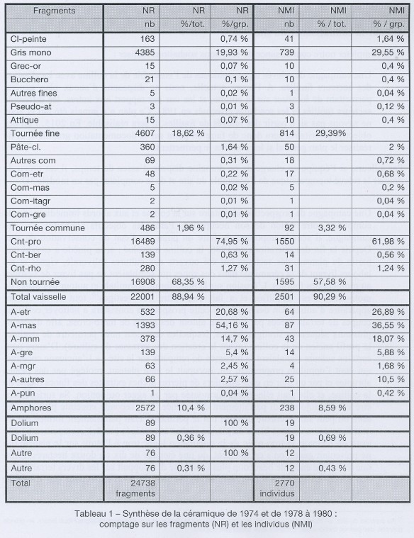 Tous les fragments de chaque catégorie de céramique sont ensuite comptés en nombre de fragments (voir tableau 1) et les formes sont déterminées (c'est l'étude typologique). A l'heure actuelle, nous avons fini les comptages pour les années 1974, 1978, 1979 et 1980. Nous avons comptabilisé et trié près de 25000 fragments. Il s'agit bien sûr d'une première étape et les données seront précisées par les spécialistes de chaque type de céramique, mais ces comptages par catégorie nous donnent une image de la vie des gens qui habitaient sur le Mourre de Sève au premier âge du Fer : ils nous renseignent sur leur mode de vie et leur mode de consommation. Ainsi, les 24688 fragments de céramique comptés représentent 2766 individus (= vases). Sur ces 2766 vases, près de 90 % appartiennent à la vaisselle, 9 % aux amphores (vases servant au transport du vin ou de l'huile) et le reste, soit 1 %, à des vases de stockage (pour la conservation des céréales). Si on regarde de plus près la vaisselle, on se rend compte qu'elle est essentiellement produite localement, qu'il s'agisse de la céramique non tournée ou de la céramique grise monochrome. La vaisselle d'importation, comme les vases venant d'Etrurie (le bucchero nero) ou du monde grec (céramique attique, céramique grecque orientale) est beaucoup plus rare, pour ne pas dire marginale. De la même manière, les amphores étant peu présentes, on peut en déduire que les habitants du Mourre ne consommaient que peu de vin... Peut-être parce qu'ils en produisaient et qu'ils n'avaient donc pas besoin d'en importer ? On a en effet trouvé de nombreux pépins carbonisés de vitis vinifera dans les fouilles, ce qui tendrait à montrer que la vigne était cultivée sur le site ou à proximité.