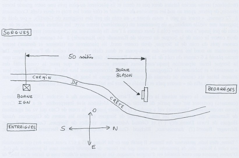 Ensuite, la copie suivait la copie de l'acte de délimitation du 4 octobre 1307, les plaintes (connues) portaient sur une partie du terroir appelé « Mellioris sive Interprodios et a Vallis Crozi (nous reconnaissons Vaucroze) vel a gardis (?) Geneste jusqu'à la route de Cato qui va ad agardium de Ramanta, qui était selon les uns du terroir de Sorgues et selon les autres de Gigognan. Aussi Hugues de Portu Domicalcy (?) et Géraud Adesmardus, syndics de Sorgues, Guillaume Augier, Bérenger Buteril (?) damoiseaux, Richard Guiraud, Jacques Ferrutii, Bertrand Bellon, avec l'approbation de la communauté de Sorgues et du recteur du Comtat Guillaume de Mandagout, archevêque d'Embrun, et Bertrand Allautessi comme syndic des hommes de Gigognan et Guillaume Gonius, chapelain, procureur des Bertrand Aimin, évêque d'Avignon et Étienne Durant au nom de « université » (communauté) de Gigognan, du consentement de l'évêque, voulant apaiser amicalement ces querelles : du côté du bois à l'ouest, dans la terre d'Étienne Gueyroni, sur quatre pas il fut placé une petite pierre, cette partie restant au terroir de Sorgues et près de la route de Bédarrides dans la terre de Bernard de Saint-André sur sept pas ; l'on fit aussi un trou et on plaça un autre petit terme, jusqu'à ce qu'ils aient de grandes pierres ; près de la Sorgue aussi, ad voltam, (la voute ?) dans la terre de Bertrand Serene, depuis ce terme allant droit par un chemin de traverse (tramite = piste ?) vers l'est, traversant cette terre ad primum copertum. ? (Accablée au premier abord ?) L'on continua et l'on plaça un autre terme in Ramanta dans le pré du seigneur (dominus-maître) Bertrand Malvezin (c'était une famille très connue d'Avignon) près de la Sorgue, étant réservé du côté du bois six cannes du chemin des hommes de Sorgues afin que ceux de Gigognan et leurs animaux ne soient pas contraints de payer le ban. Ces opérations furent récapitulées dans ledit bois «Bocayssorum » au terroir de Sorgues, en présence de Laugier Bermond, Hugues de Laudun damoiseaux, Guillaume de Cero, Pons Ruffi et Bertrand Abrioni de Monteux.