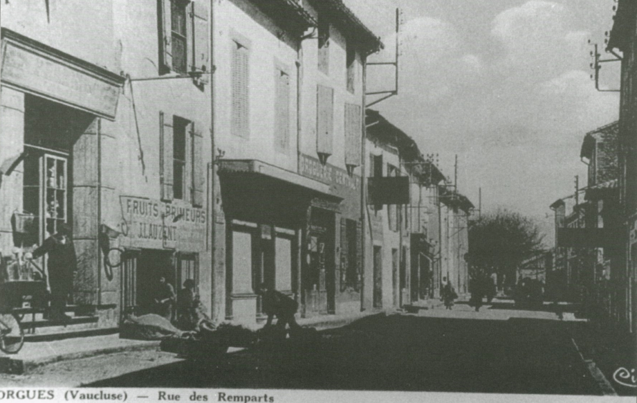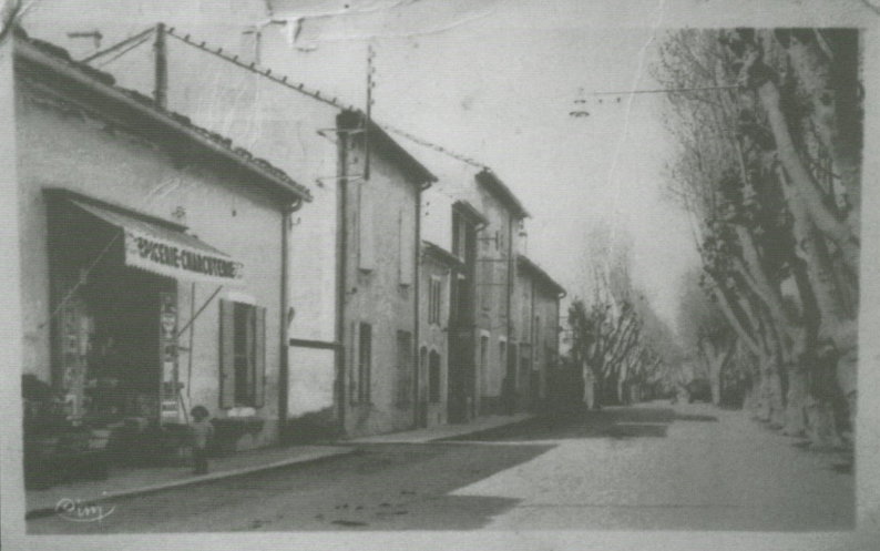 Les rues de notre commune sont éclairées par des lanternes à gaz. C'est l'époque des tramways dont on distingue bien les rails. À droite, le café du Commerce devenu banque Populaire de Provence et de Corse en 2002 et, à gauche, le mur du parc puis la cour et l'atelier du charron.