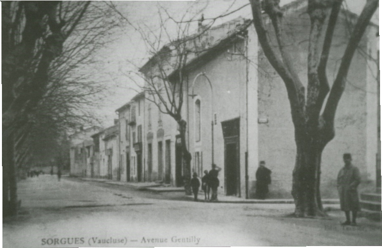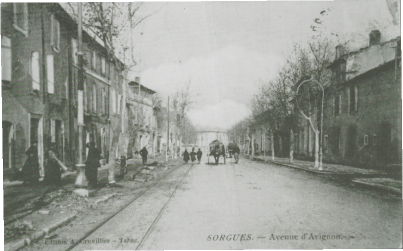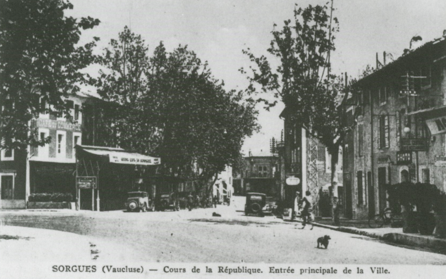 L'entrée de Sorgues vers 1940 à l'époque où le cours était ombragé de platanes. La terrasse du café du Commerce était couverte et vitrée.