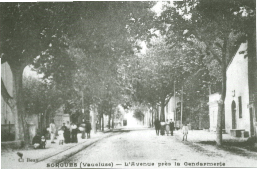 L'avenue était bordée de nombreux platanes dont deux seuls ont été épargnés vers 1970 : le premier est à gauche, près de l'ancienne gendarmerie. Un groupe de «voyageurs» attend le tramway que l'on distingue bien. À droite, le deuxième bâtiment est celui de l'octroi qui a été démoli. Il n'avait plus d'utilité et cela a permis d'agrandir le carrefour.