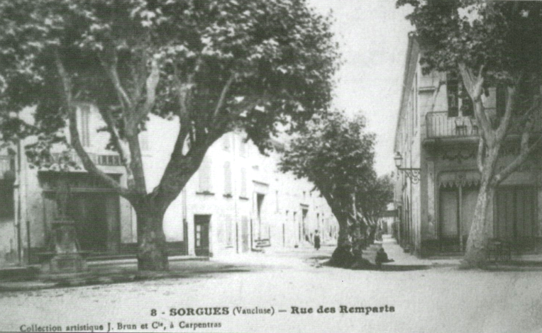 La rue des Remparts vers 1935 —1938. Sur la droite, les platanes ont été abattus alors qu'ils sont toujours là, après le carrefour vers l'église.