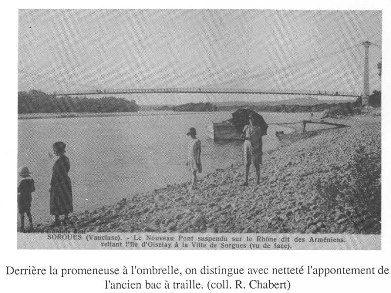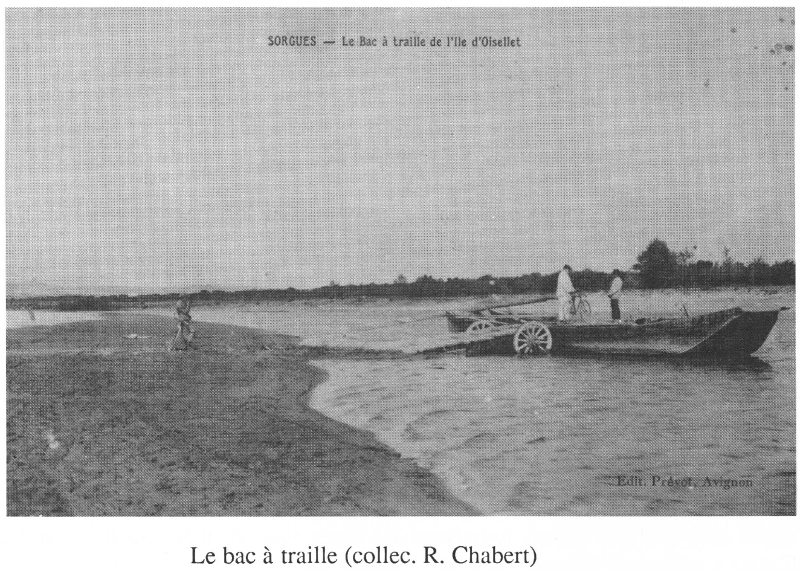 Depuis des temps immémoriaux l'unique moyen de communication avec l'extérieur fut le bac à traille. En ce début de siècle il en existre trois, tous privés, celui qui conduit à SAUVETERRE (gard), par un autre bras du Rhône, dit "Rhône Vif", à hauteur de la ferme de la Dragonette, un autre au nord de l'ile qui la relie à CHATEAUNEUF DU PAPE, et celui qui communique avec Sorgues. Ce dernier d'abord établi à l'usage de la famille d'OISELAY (1) s'étendit aux nouveaux propriétaires de l'île au cours du 19ème siècle. Cependant l'utilisation du bac est source de multiples difficultés. La construction d'un pont permettrait aux "Sorguais de goûter les charmes de l'isle qui leur constituerait ainsi à une très courte dis-tance une sorte de parc immense et vraiment très agréable (2). Dans une longue pétition du mois de mai 1913, Monsieur Benoît REBOUL les énumère :