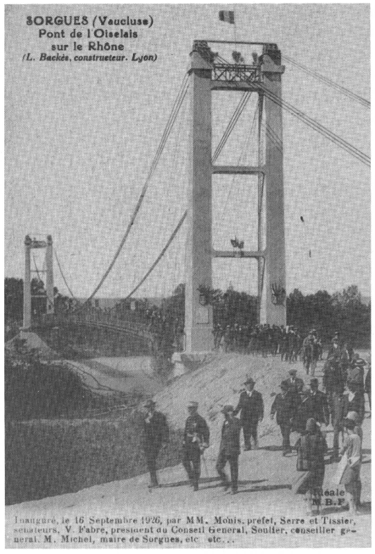 Le 1er mai 1924 se constitue entre quinze propriétaires, une nouvelle association dénommée "Association du Pont de l'île d'Oiselet" qui se donne pour vocation la construction de l'ouvrage dont elle sera maîtresse d'oeuvre. Elle dépose le 28 janvier 1925 le permis de construire. Il sera bâti à 160 mètres en amont du bac existant, d'une travée de 157,5 mètres. Chaque culée supportera deux pylones d'une hauteur totale de 18,25 m. Le tablier sera établi pour une seule voie charretière de 2,3 m, avec deux trottoirs de 0,5 m chacun et un garde corps de 1,08 m de hauteur. La chaussée proprement dite comportera des files non jointives de madriers de chênes, lesquelles seront recouvertes par des madriers jointifs en sapin, des plaques de tôles striées recouvriront les trottoirs. L'accès au pont sera interdit aux camions automobiles d'un poids supérieur à 6 tonnes, et il ne devra être engagé qu'un de ces véhicules à la fois. Il sera formellement interdit à plus de quatre véhicules à un collier et à plus de deux véhicules à deux colliers... Le pont sera visité tous les cinq ans par l'Ingénieur d'arrondissement aux frais de l'association (7). Le devis de construction, établi par le Génie Rural en 1924, s'élève à 390 000 francs, dont 130 000 subventionnés par l'Etat. Le surplus devant être assumé par tiers entre le Département, la Commune et les Propriétaires. Sorgues, en définitive, ne participe qu'à hauteur de 15 000 francs. Ses finances sont lourdement grevées par les dépenses d'assistance à 2 à 3 000 ouvriers (sic) habitant sur son territoire et qui travaillent dans des usines situées dans les communes avoisinantes et desquelles communes Sorgues ne retire aucune subvention (8).