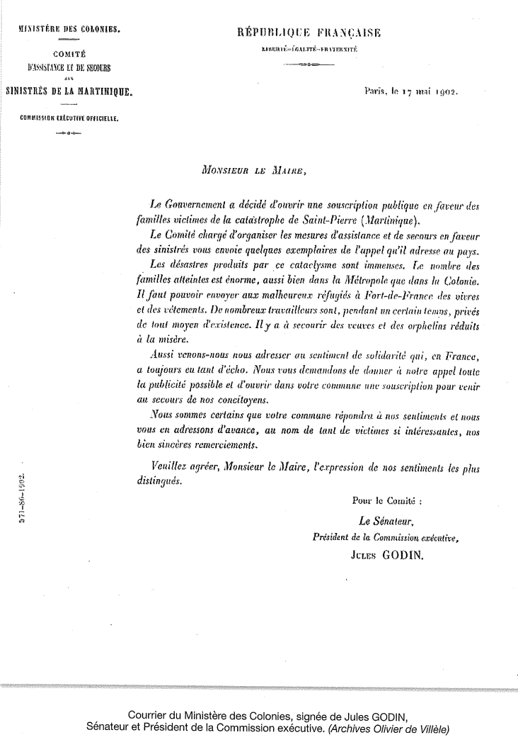Il invitait à la générosité des communes. Dans la séance du 3 juin, Auguste Bédoin, maire, devant les conseillers municipaux, donna lecture d'une lettre du 17 mai, adressée par M. Godin (3), président du comité de secours aux sinistrés de la Martinique. Il sollicitait le concours de la ville pour venir en aide aux victimes. Il soulignait l'extrême détresse des familles : «... il faut pouvoir envoyer aux malheureux réfugiés à Fort-de-France des vivres et des vêtements. De nombreux travailleurs sont, pendant un certain temps, privés de tout moyen d'existence. Il y a à secourir des veuves et des orphelins réduits à la misére.. », « Le conseil, s'inspirant de sentiments que suscite une si grande catastrophe, décida qu'une souscription publique serait ouverte. ». (4)