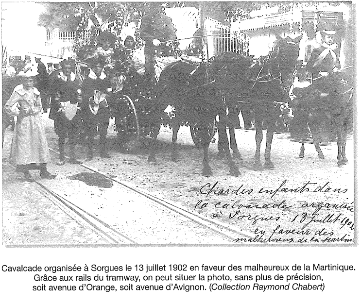 Nous ignorons si ce geste généreux émut les Sorguais mais, le 13 juillet 1902, une cavalcade fut organisée en faveur des sinistrés de la Martinique. La carte postale ci-dessus montrait le char des enfants, elle était adressée aux demoiselles Schlosing, petites-filles d'Henri Leenhardt.