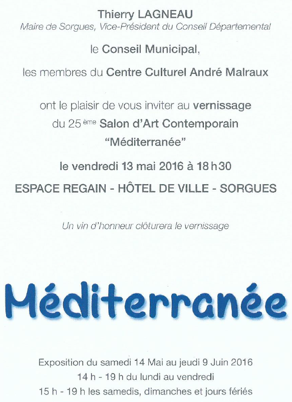 Le vendredi 13 mai à 18h30 aura lieu le vernissage de l'exposition du 25ème salon d'art contemporain à l'espace Regain de l'hôtel de ville de Sorgues.
