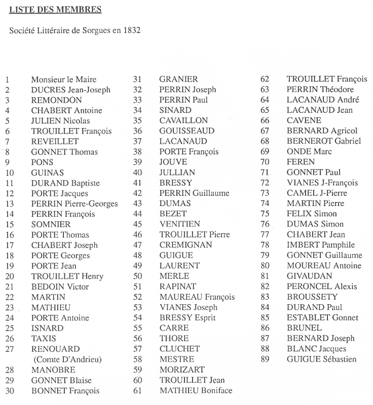 Cet homme instruit et cultivé décide de perfectionner l'éducation des Sorguais par la lecture. Le ler avril 1832, avec l'aide de quelques Sorguais éclairés réunis en son domicile, il fonde la Société d'Émulation Littéraire de Sorgues. Cette association se consacrera au développement du savoir de chacun de ses membres "par la communication mutuelle de leurs connaissances dans des réunions fraternelles et périodiques" et grâce "à la formation progressive d'une bibliothèque" (49). Jean-Joseph DUCRES en devient le secrétaire et le bibliothécaire. Son dévouement, tant dans son action d'instituteur que dans sa tâche au sein de la société de lecture est sans borne. En remerciements, ses amis sociétaires font peindre son portrait afin qu'il soit accroché à un des murs de la salle de lecture.
