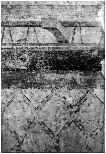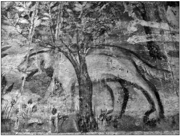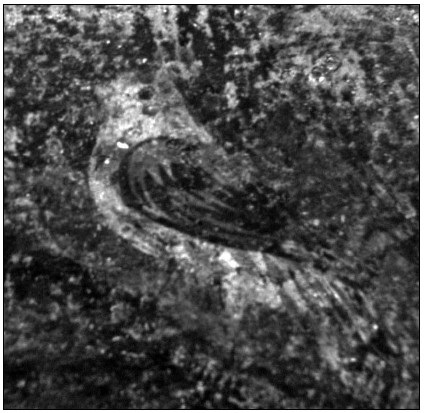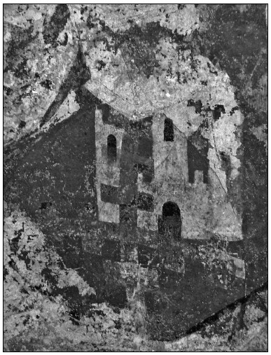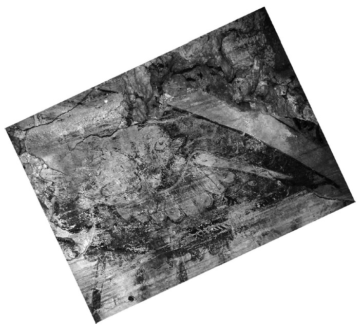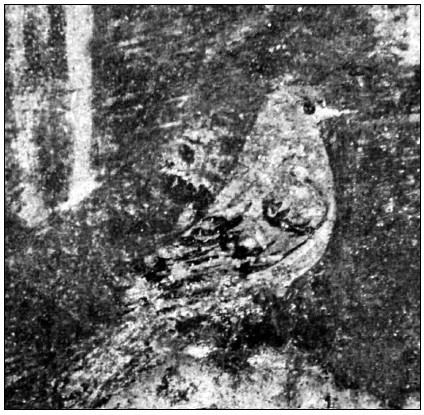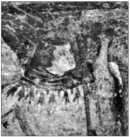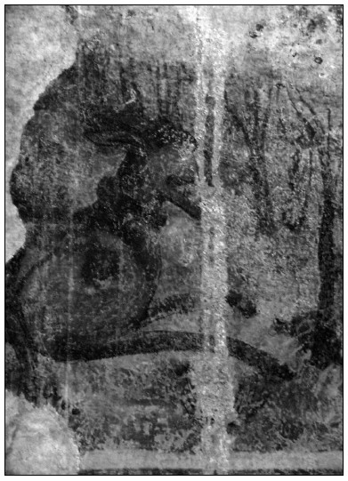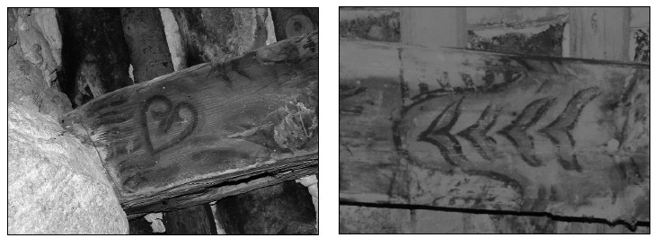 Ce fut avec une intense émotion que j’accédais moi-même à cette maison chargée d’histoire, son propriétaire m’ayant aimablement autorisé à la visiter et à la photographier. Parmi les éléments de décors restés en place sur les poutres, il y a un très beau coeur, et un épi de blé peint avec des pigments noirs et rouges. Dans l’angle d’un mur, il y avait également des restes de fresques difficiles à interpréter. Quelle ne fut pas ma surprise de découvrir après le traitement informatique du contraste de ma photographie qu’un hibou aux ailes déployées me regardait fixement ! On distingue en effet nettement une tête ronde avec deux grands yeux, un bec et deux « oreilles » ou plutôt les deux aigrettes. L’oiseau a deux ailes déployées avec de longues plumes.