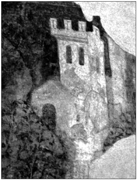 Une bastide comprenant un corps de logis et une tour percée de trois fenêtres apparaît également sur deux tableaux en arrière-plan sur une colline. Ce n’est sans doute pas un hasard sinon pourquoi l’avoir répété par deux fois à l’identique ? Il pourrait s’agir d’une bastide ou d’une des livrées cardinalices qui se trouvait à proximité de la ville de Pont-de-Sorgues au XIVème siècle. Les peintres se sont-ils inspirés de ce qu’ils pouvaient réellement voir à Pont-de-Sorgues ? Rêvons un peu… Nous sommes au 27 rue de la Tour, le matin d’une belle journée du XIVème siècle. Les peintres sont arrivés très tôt pour couvrir les murs d’un enduit blanc, ils ont préparé leurs couleurs. L’enduit est encore humide. Ils ont ouvert les volets de bois pour travailler en pleine lumière. L’un d’eux se penche par la fenêtre… Il se trouve en hauteur, à l’étage, à quelque centaines de mètres du palais pontifical. Entre la Sorgue et le palais, une partie du jardin palatial est ceinturée par un mur. Il ne voit que les cimes des arbres. Sur une branche élevée, un rouge-gorge s’est mis à chanter…
