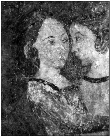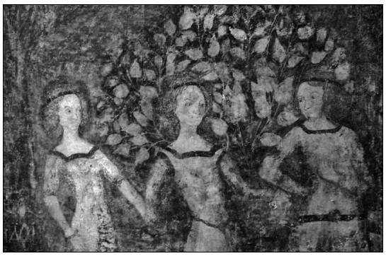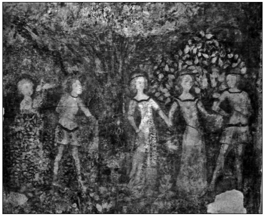 Les relations courtoises entre hommes et femmes sont un autre thème traité par les fresques de Sorgues. Il semble que les peintres aient voulu illustrer un conte poétique, une histoire légendaire ou un fabliau de troubadour, mais les fresques sont lacunaires et on ne connaît pas exactement l’ordre de succession des tableaux qui ont été arrachés des murs et découpés dans le but de les vendre chacun isolément. Ici, il y a une scène charmante, dite « la carole » : deux couples de jeunes gens semblent danser au son de la flûte d’un musicien placé en retrait… Là, un jeune élégant semble attirer l’attention de deux demoiselles enlacées, on a donné à ce tableau charmant un titre évocateur : « le baiser ». Il y a également une « dame à l’oiseau ». Sur la majorité des tableaux sont représentés avec beaucoup de soins, un ou plusieurs oiseaux qui semblent animer de leurs chants le théâtre de verdure. Des grives ou des rouges-gorges ? Peut-être les deux.