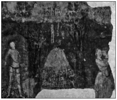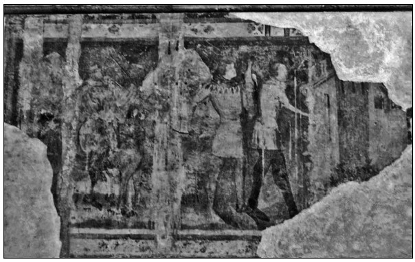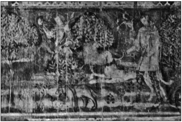 Parmi la série des fresques exposées au musée du Petit-Palais, il y en a trois qui mettent en scènes des personnages pratiquant la chasse dans un décor de forêt suggéré par des arbres et des bosquets : certains d’entre eux, vêtus de capuchons, sont sans doute les valets conduisant les chiens, un autre semble conduire par la bride un cheval portant un bagage, un autre est armé d’un épieu et sonne du « cornet ». Un des personnages attire l’attention car il est vêtu d’un capuchon décoré de pampilles, il est chaussé de poulaines et transporte un faucon perché sur le gant qui lui couvre la main gauche. C’est un précieux témoignage de l’art de vivre aristocratique et des coutumes de la société médiévale. En effet, la chasse n’est pas seulement une activité utilitaire pratiquée dans le but de consommer la viande du gibier. C’est aussi et surtout une activité sportive et un divertissement très codifié, réglementé qui exclut de fait les paysans (sauf en ce qui concerne le petit gibier capturé avec des pièges, des filets ou des collets ).