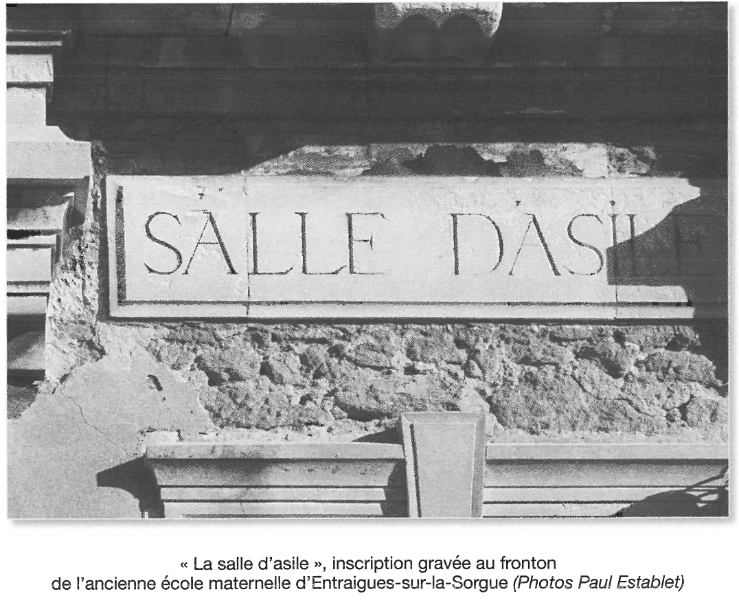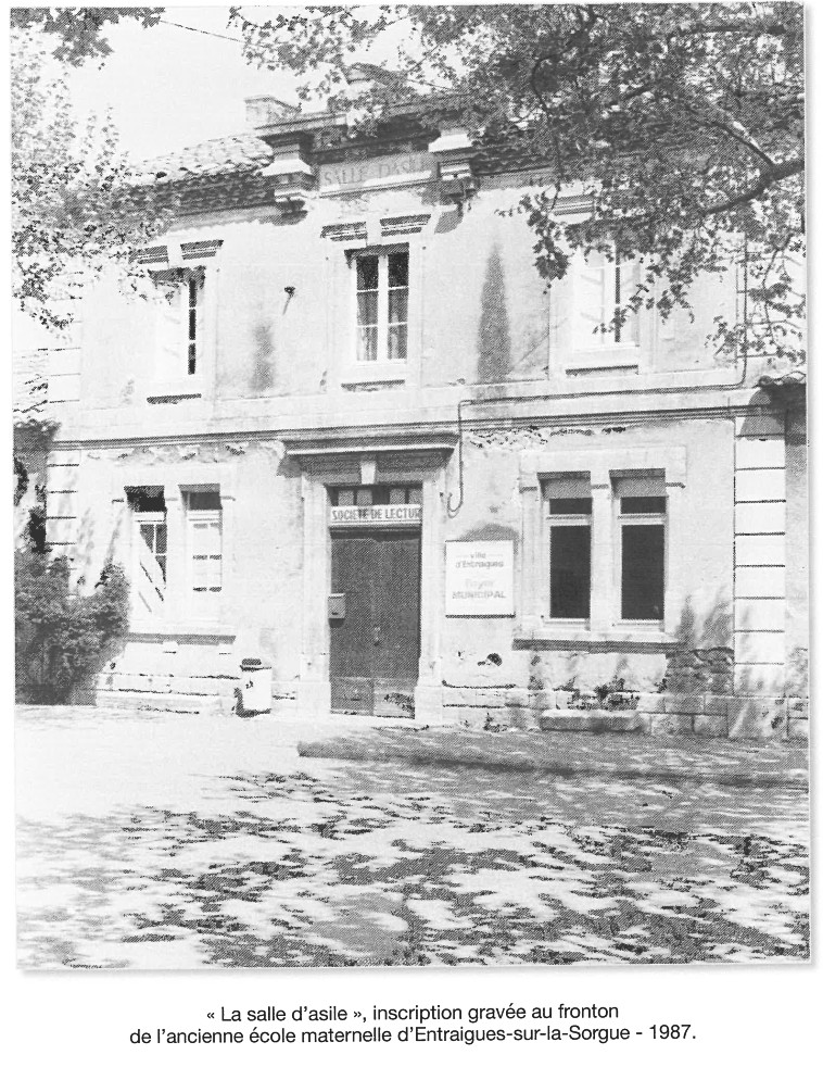 En 1868, le rapport de l'inspecteur d'Académie sur l'instruction primaire consignait 23 salles d'asile, dont trois laïques, notamment une à Sorgues. Le surplus était des écoles congréganistes. Les soeurs de la Présentation de Bourg-Saint-Andeol dirigeaient celle de Sorgues (11)